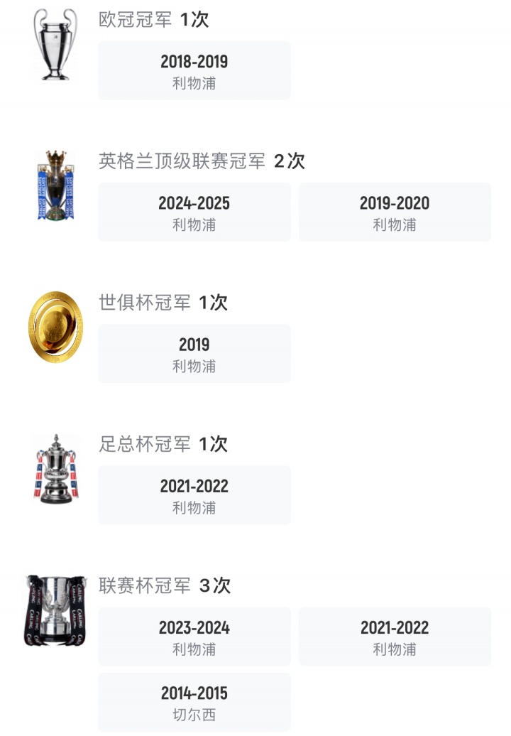 團(tuán)隊(duì)榮譽(yù):2次英超冠軍、1次歐冠冠軍、1次世俱杯冠軍、1次歐超杯冠軍、1次足總杯冠軍、2次聯(lián)賽杯冠軍、1次社區(qū)盾杯冠軍。