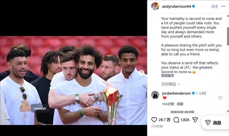 直播吧3月25日訊 薩拉赫官宣賽季結(jié)束后離隊(duì),他的利物浦隊(duì)友羅伯遜通過社交媒體送上告別。