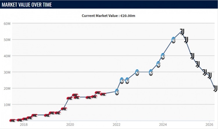 2024年夏窗庫普梅納斯加盟尤文時(shí),身價(jià)達(dá)到巔峰(5500萬歐)。當(dāng)時(shí)他的轉(zhuǎn)會費(fèi)總價(jià)最高可達(dá)6070萬歐,德轉(zhuǎn)目前顯示這筆轉(zhuǎn)會交易的費(fèi)用為5840萬歐。