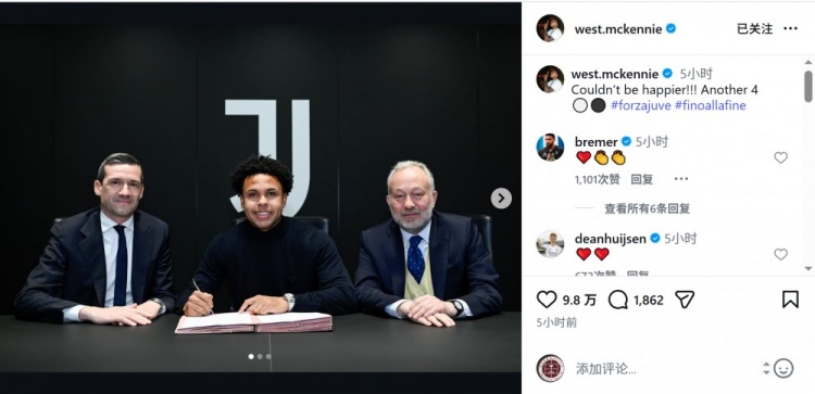 直播吧3月3日訊 尤文中場麥肯尼更新社媒動態(tài),慶祝與俱樂部續(xù)約。