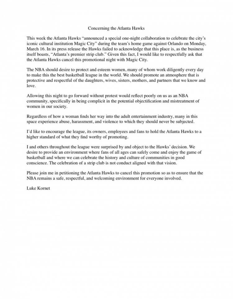 本周,亞特蘭大老鷹隊(duì)“宣布了一項(xiàng)特別的合作之夜,以慶祝該市標(biāo)志性文化機(jī)構(gòu)Magic City”,此次活動(dòng)將在球隊(duì)3月16日周一主場(chǎng)對(duì)陣奧蘭多魔術(shù)隊(duì)的比賽中進(jìn)行。在其新聞稿中,老鷹隊(duì)未能承認(rèn)這個(gè)地方,正如該商家自己所標(biāo)榜的那樣,他們是“亞特蘭大首屈一指的脫衣舞俱樂(lè)部”。鑒于此事實(shí),我謹(jǐn)誠(chéng)摯地請(qǐng)求亞特蘭大老鷹隊(duì)取消與Magic City的這個(gè)推廣之夜。