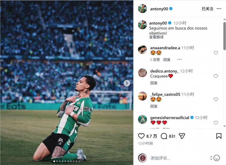 此役安東尼為貝蒂斯踢滿全場,并倒鉤破門,賽后他在社交媒體上曬出慶祝進球的照片,配文:“我們繼續(xù)朝著目標(biāo)前進!”