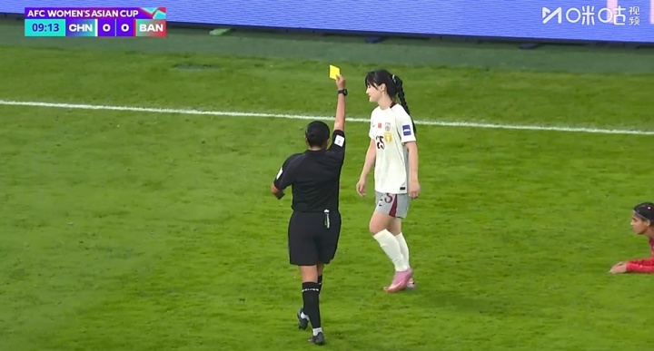比賽第9分鐘,呂亞童拉人放倒對(duì)手,吃到一張黃牌。