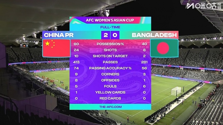 直播吧03月03日訊 女足亞洲杯小組賽B組第1輪,中國(guó)女足2-0戰(zhàn)勝孟加拉國(guó)女足,全場(chǎng)數(shù)據(jù)如圖。