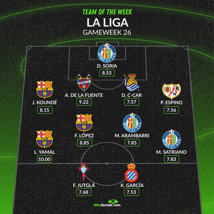 直播吧3月3日訊 西甲第26輪比賽戰(zhàn)罷,WhoScored列出了本輪最佳陣容,亞馬爾領(lǐng)銜。