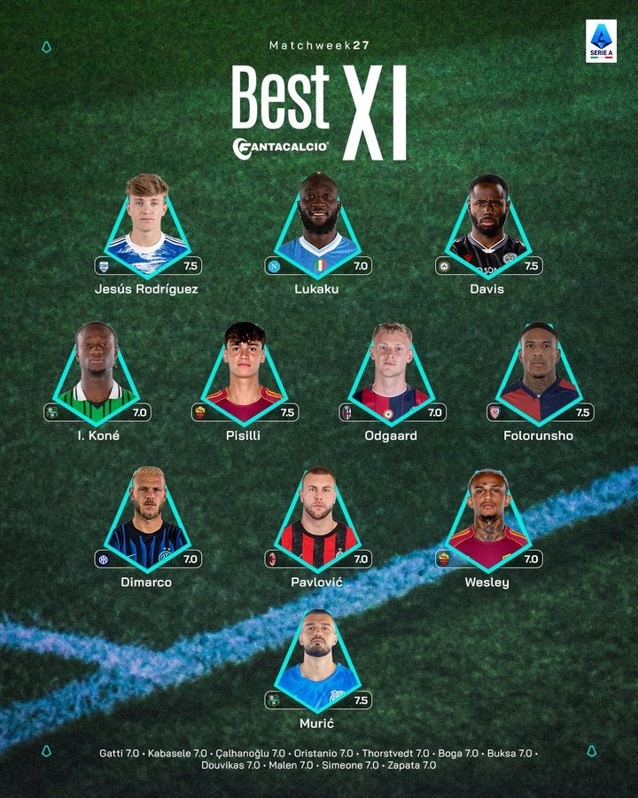 中場:I·科內(nèi)(薩索洛)、皮西利(羅馬)、奧德加德(博洛尼亞)、弗羅倫肖(卡利亞里)