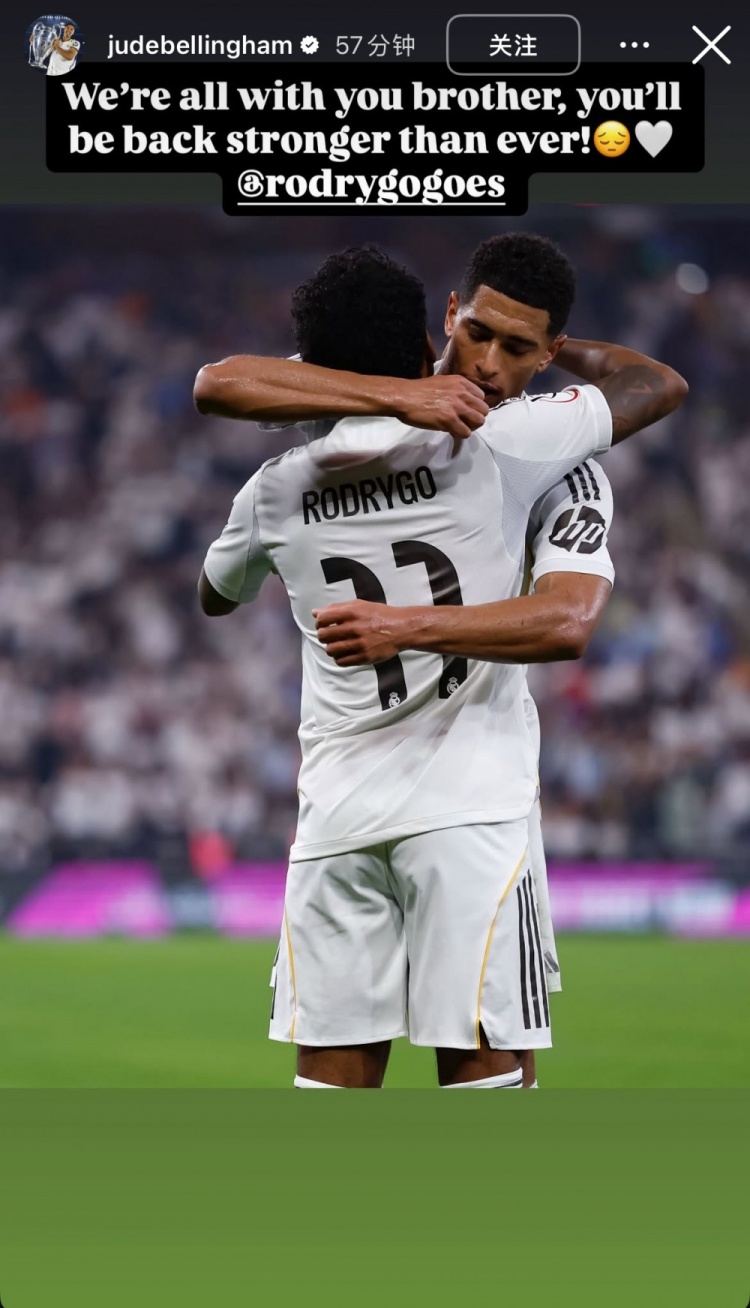 貝林厄姆更新社媒,曬出和羅德里戈擁抱的賽場(chǎng)照并鼓勵(lì)后者:“我們與你同在,你將會(huì)比以往更強(qiáng)大的姿態(tài)歸來(lái)!”