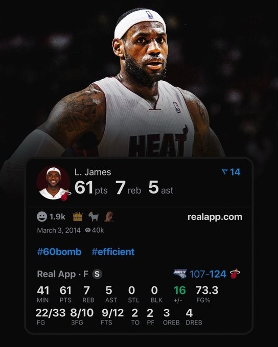 全場比賽,詹姆斯出戰(zhàn)41分鐘33投22中,三分球10中8、罰球12中9,砍下61分7籃板4助攻,帶領(lǐng)熱火124-107戰(zhàn)勝對手。