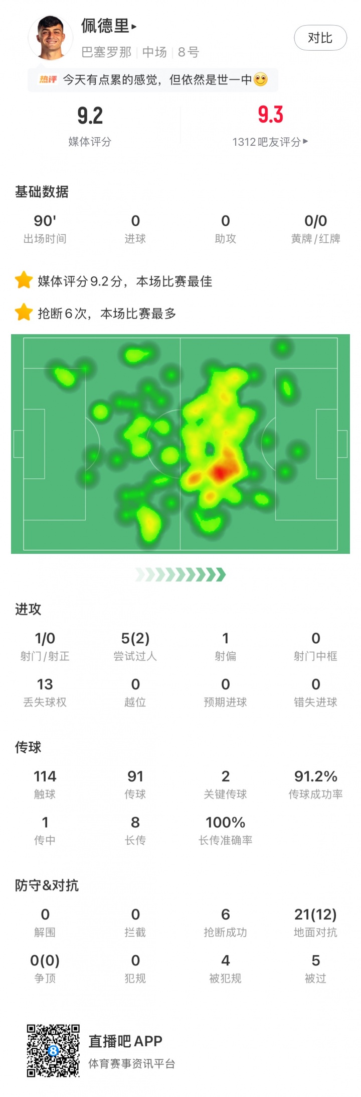 此外佩德里全場6次搶斷,21次地面對抗成功12次。