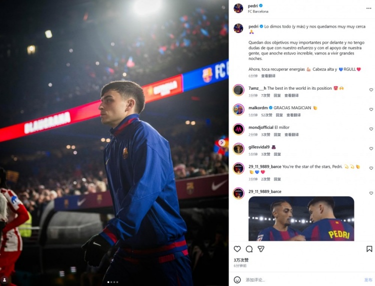 本場比賽佩德里首發(fā)表現不俗,賽后他也在個人社媒曬出本場照片,配文鼓勵球隊寫道:“我們傾盡全力,距離目標僅一步之遙