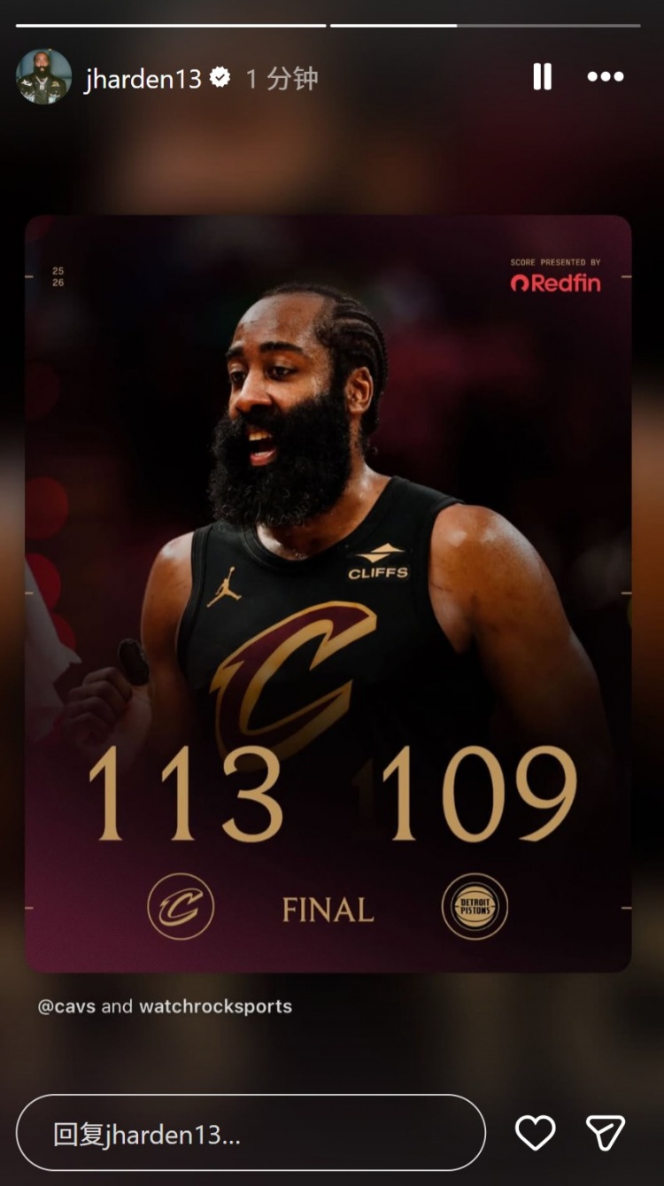 賽后哈登在INS上轉(zhuǎn)發(fā)了騎士官方曬出的本場(chǎng)贏球海報(bào),封面人物是自己。