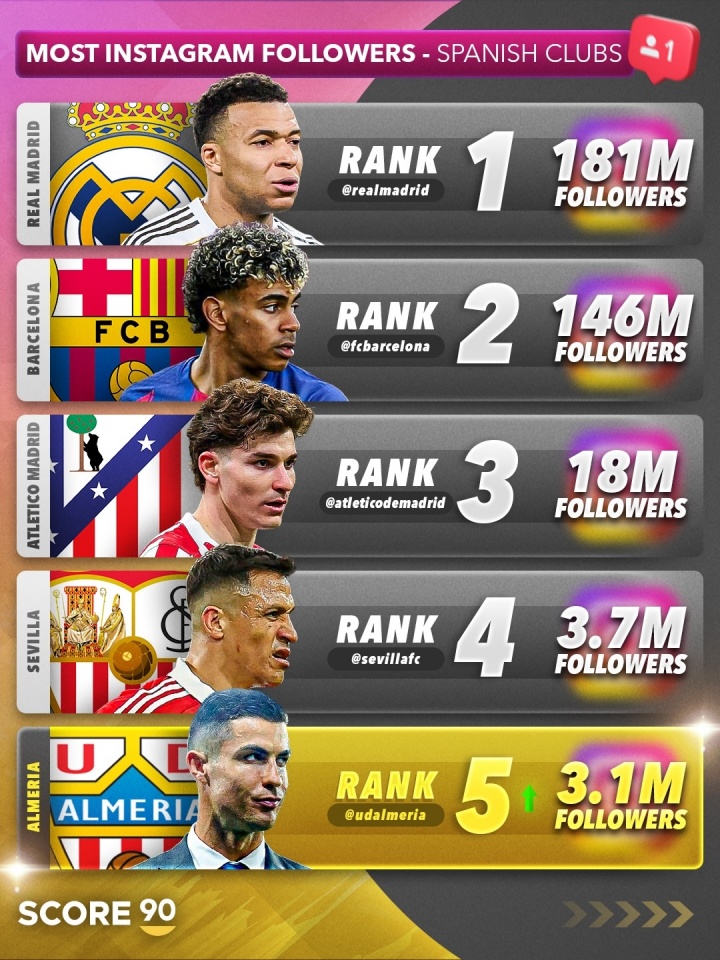 直播吧03月04日訊 據(jù)Score90統(tǒng)計(jì),在C羅收購(gòu)了西乙球隊(duì)阿爾梅里亞25%的股份后,阿爾梅里亞的社媒粉絲數(shù)瘋漲,如今阿爾梅里亞的IG賬號(hào)已經(jīng)擁有超過310萬粉絲,在所有西班牙俱樂部中排名第五,而前四支球隊(duì)均為西甲球隊(duì)。