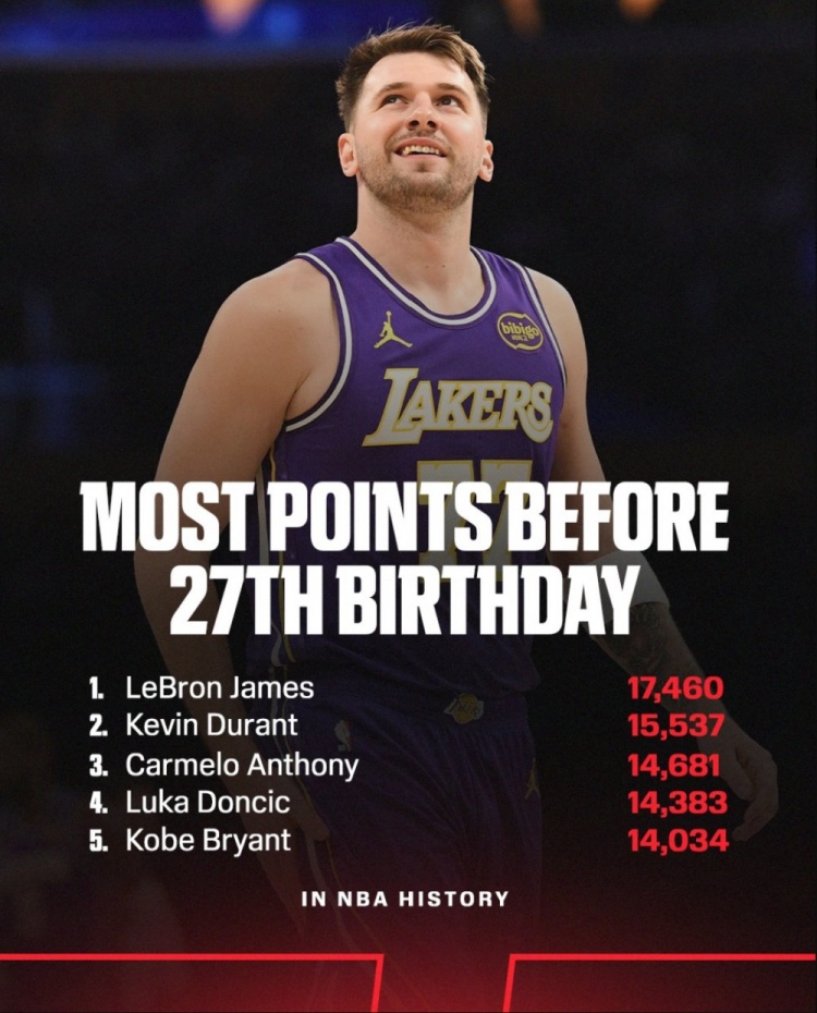 據(jù)統(tǒng)計,東契奇在27歲合計得到14383分,同期歷史第四高,僅次于詹姆斯、杜蘭特和卡梅隆·安東尼。