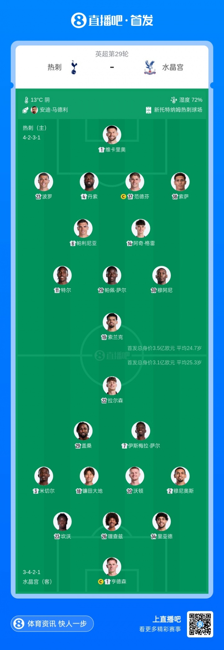 直播吧3月6日訊 北京時(shí)間3月6日凌晨4:00,英超第29輪,熱刺vs水晶宮。賽前雙方公布了本場(chǎng)比賽的首發(fā)名單。