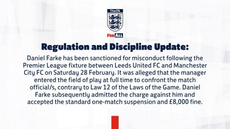 英足總發(fā)布公告:“丹尼爾·法爾克因在利茲聯(lián)對(duì)陣曼城的比賽結(jié)束后存在不當(dāng)行為而受到處罰。據(jù)指控,該主教練在全場(chǎng)結(jié)束時(shí)進(jìn)入比賽場(chǎng)地與裁判發(fā)生對(duì)峙,此舉違反了《足球競(jìng)賽規(guī)則》第12條。丹尼爾·法爾克承認(rèn)該項(xiàng)指控,并接受標(biāo)準(zhǔn)的一場(chǎng)停賽處罰,以及8000英鎊罰款。”