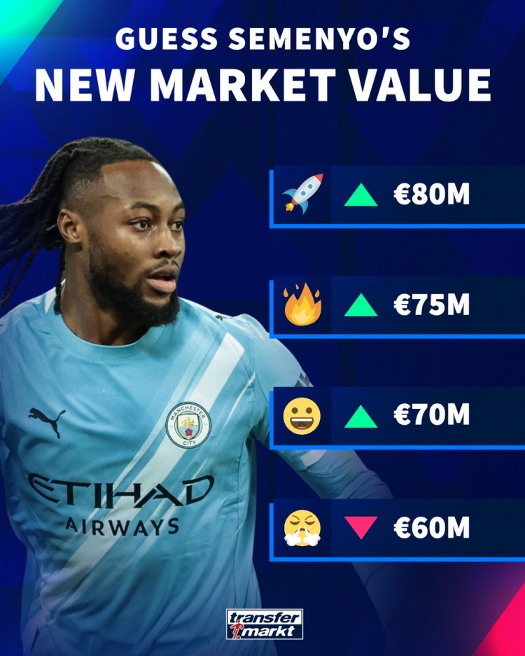 直播吧3月6日訊 德國轉(zhuǎn)會市場預(yù)熱曼城前鋒塞梅尼奧的最新身價,他的身價最高可能達(dá)到8000萬歐,最低6000萬歐。