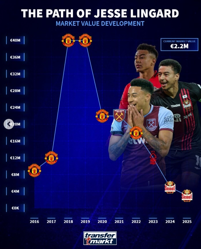 林加德出自曼聯(lián)青訓,憑借生涯初期的出色表現(xiàn)身價一路攀升,在2018年-19年達到巔峰的4000萬歐,隨后開始逐漸走下坡路,經歷西漢姆、諾丁漢森林以及首爾FC的效力后,目前的身價只有220萬歐。