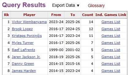 據(jù)統(tǒng)計(jì),這是文班亞馬生涯第15次單場(chǎng)拿下至少4次封蓋并投進(jìn)4個(gè)三分,歷史排名第一!榜單如下: