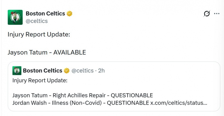 凱爾特人官方更新了塔圖姆的情況,他今天將可以出戰(zhàn)。