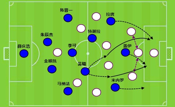就像是這一次的反擊,當(dāng)盧永濤直塞找到安永佳時(shí),加布里埃爾快速前插作為箭頭,這時(shí)候就需要中鋒拿得住球完成下一步的輸送,可惜安永佳被拉莫斯犯規(guī)。