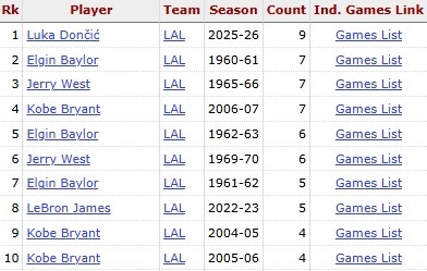 東契奇得到44分9籃板5助攻,這讓他單賽季40+5+5的次數(shù)(10次)位列湖人隊(duì)史第一。