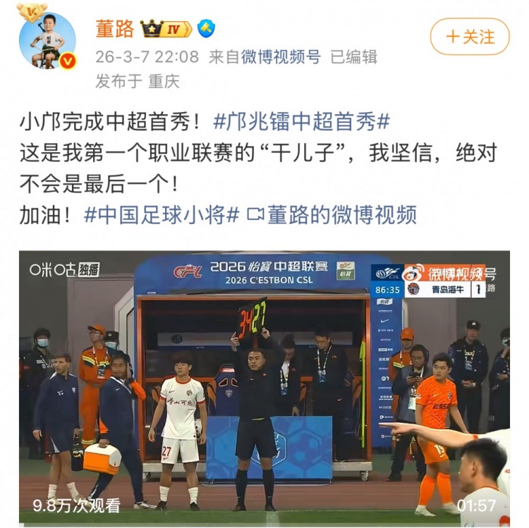 賽后董路在社媒曬出鄺兆鐳替換上場的時刻,并配文寫道: