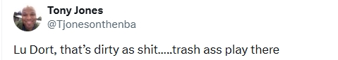 美記Tony Jones在個(gè)人社交媒體上寫到:“多特這也太臟了吧……純垃圾動(dòng)作啊,太賤了?!?/p>