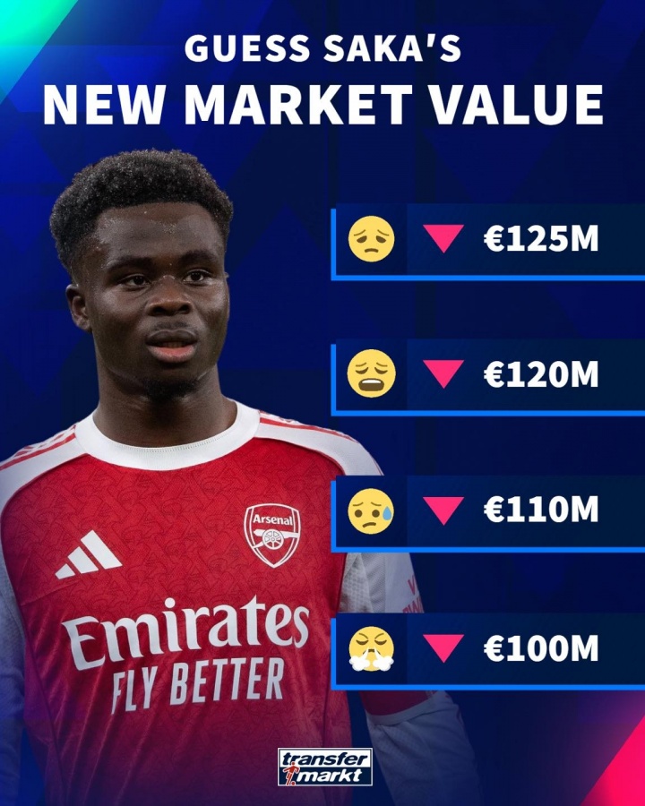 直播吧03月08日訊 德轉(zhuǎn)明天將更新英超球員身價(jià),它們今天預(yù)熱了薩卡身價(jià)將在更新后下跌,最低將跌至1億歐。
