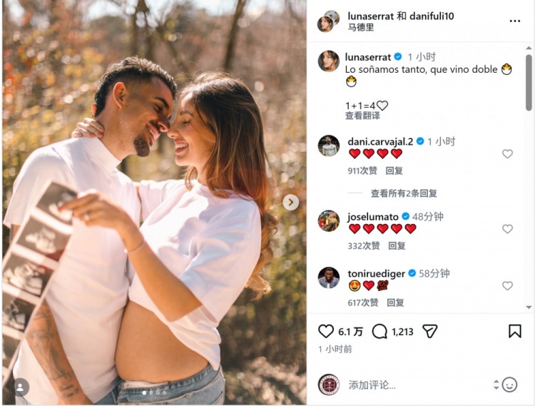 塞巴略斯、盧娜社媒曬出合照,盧娜配文:“我們夢寐以求了這么久,結(jié)果迎來雙倍驚喜,1+1=4。”