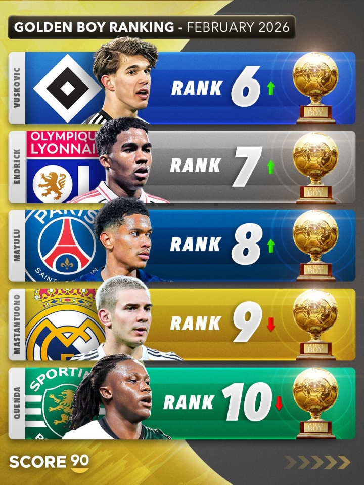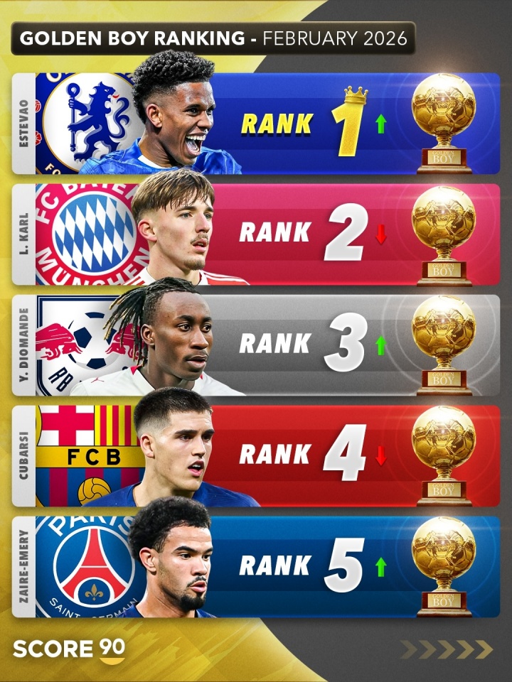 直播吧02月28日訊 Score90給出了2026年金童獎2月份最新排名預測,埃斯特旺升至榜首,卡爾第二,迪奧曼德升至第三。