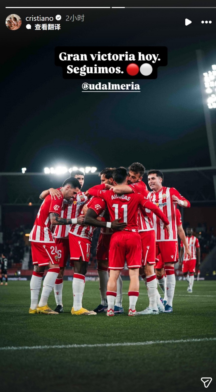 此役過后阿爾梅里亞升至西乙積分榜第二位,作為這家俱樂部的股東,C羅社媒曬出球員們的照片,配文:“今天取得重要勝利,繼續(xù)前進?!?/p>