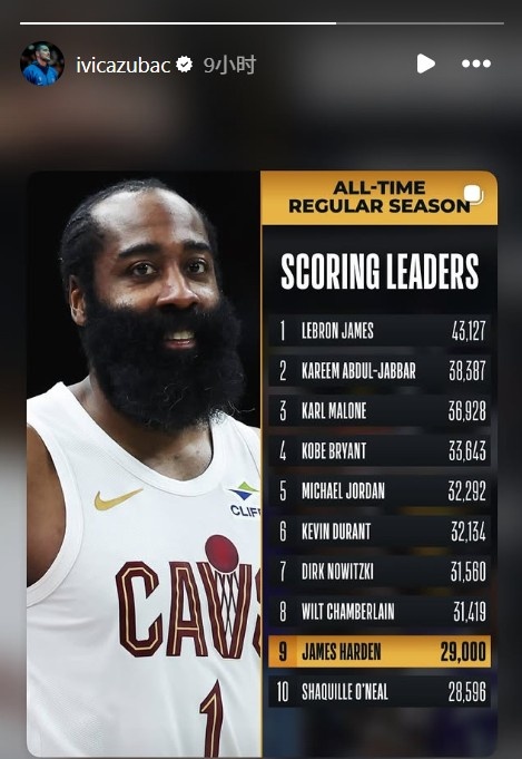 賽后,前隊友祖巴茨ins快拍祝賀哈登達成這一成就!