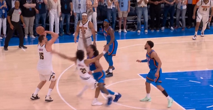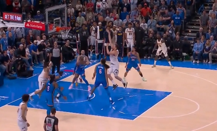 裁判吹罰約基奇三分有效,穆雷加罰一球;兩人合力極限3+1追平比分。掘金126-126雷霆