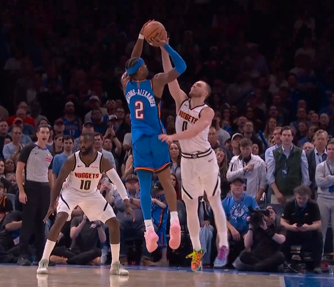末節(jié)2.7秒,亞歷山大左側(cè)45°橫撤步三分命中,完成準(zhǔn)絕殺!掘金126-129雷霆。