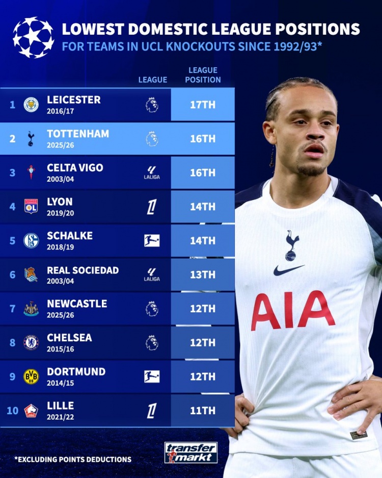 直播吧3月10日訊 德國(guó)轉(zhuǎn)會(huì)市場(chǎng)統(tǒng)計(jì)了歐冠改制以來(lái)淘汰賽球隊(duì)的聯(lián)賽排名,并列出聯(lián)賽排名最低歐冠淘汰賽球隊(duì)榜單,本賽季熱刺排名僅高于2016-2017賽季的萊斯特城。