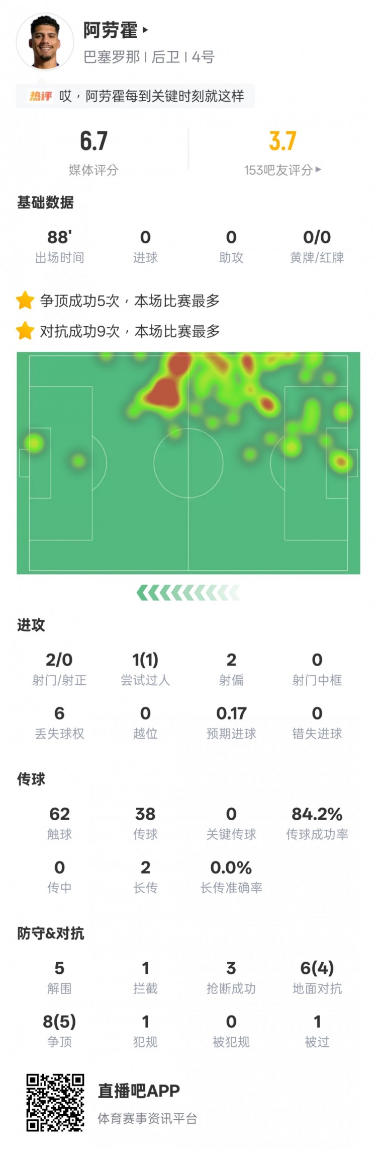 直播吧3月11日訊 歐冠1/8決賽首回合,巴薩客場1-1戰(zhàn)平紐卡斯?fàn)?。阿勞霍本場首發(fā)出戰(zhàn),5次爭頂全場最多,9次對抗成功全場最多,還有1次過人成功和5次解圍,但在巴恩斯的進球過程中回防緩慢,評分6.7。