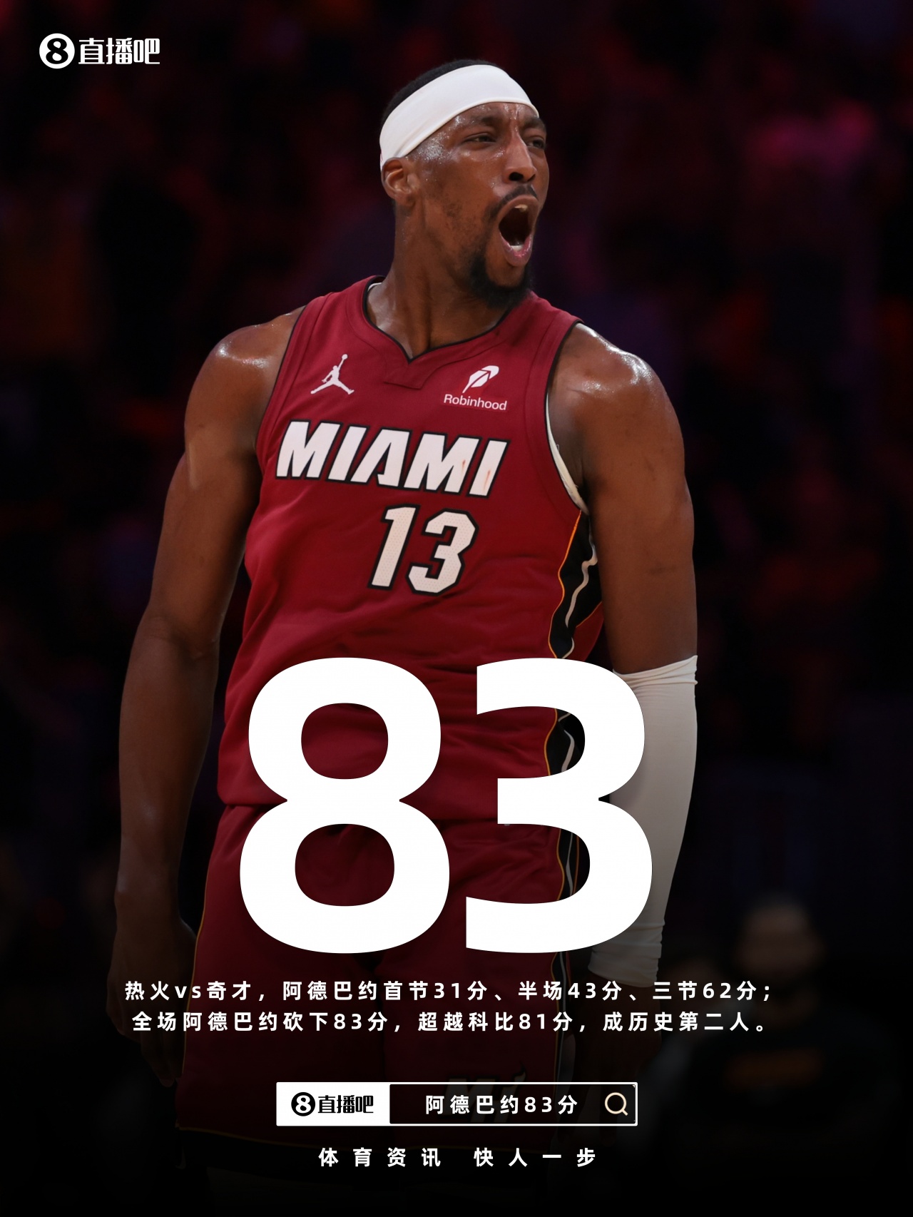全場(chǎng)比賽,阿德巴約出戰(zhàn)42分鐘,投籃43中20,三分22中7,罰球43中36,砍下83分。僅次于張伯倫的100分。