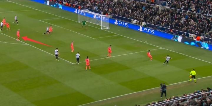 紐卡球門球開出后阿勞霍得以回到場內(nèi),他小跑回本方后場,但到了禁區(qū)弧頂就沒有再往禁區(qū)內(nèi)移動,結果巴恩斯在禁區(qū)內(nèi)無人盯防輕松破門。