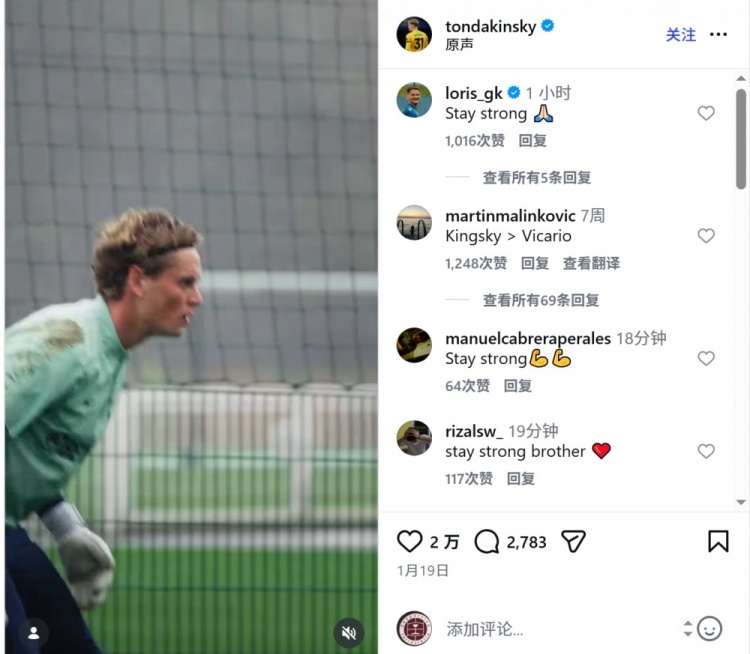 球迷們?cè)诮鹚够淖罱粭l社媒動(dòng)態(tài)下面留言,鼓勵(lì)這位22歲的門將“保持堅(jiān)強(qiáng)”、“不要放棄”。