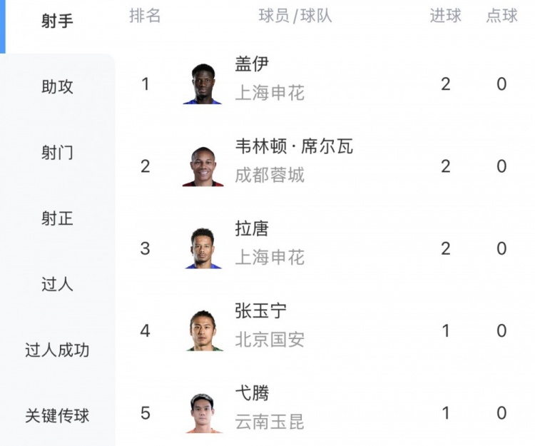 2球 拉唐(上海申花)、蓋伊(上海申花)、韋林頓·席爾瓦(成都蓉城)
