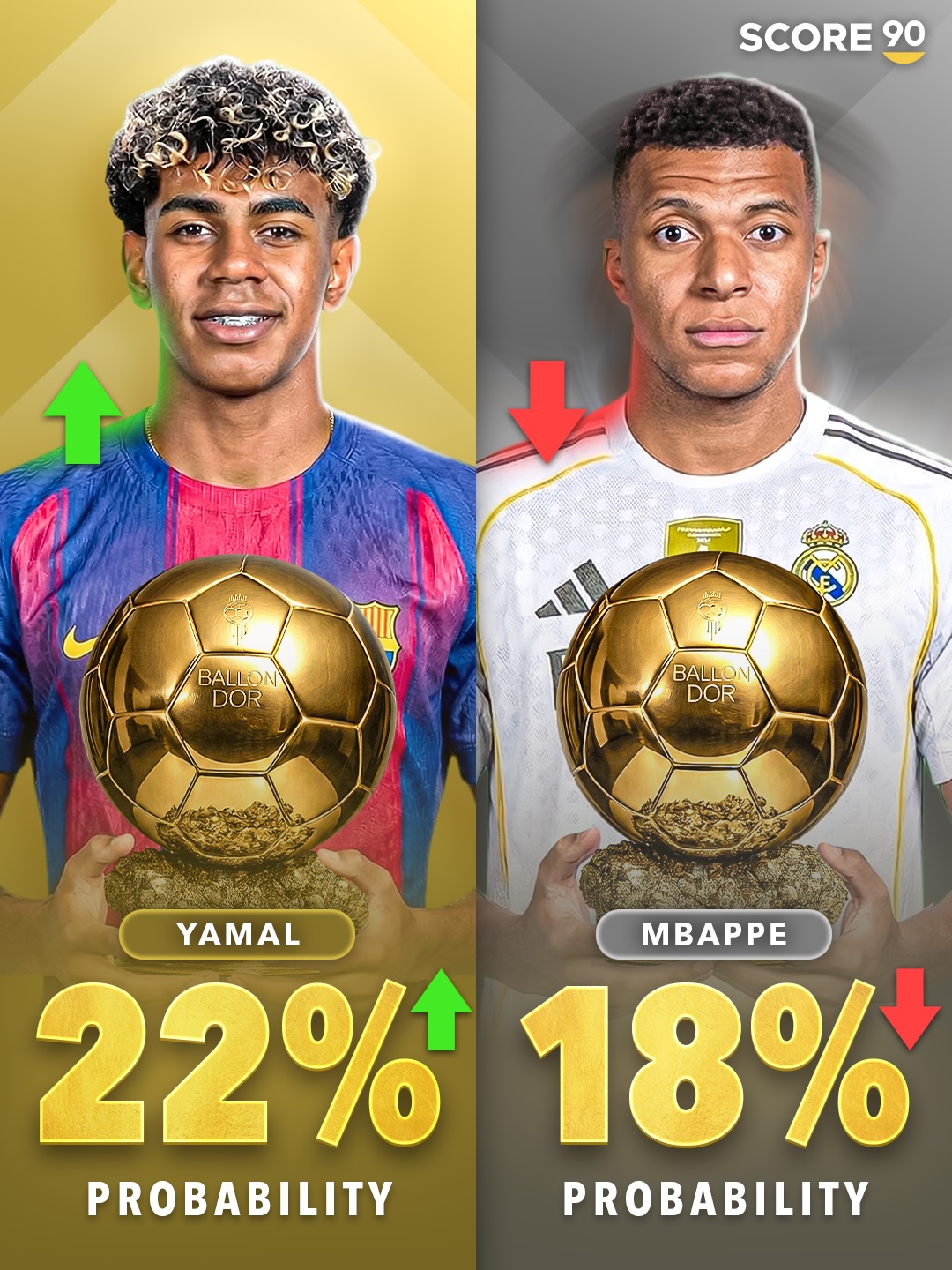 直播吧03月11日訊 外媒score90近日根據(jù)相關(guān)機構(gòu)賠率,更新了今年金球獎的獲獎概率,姆巴佩的獲獎概率下跌到18%,而巴薩小將亞馬爾則上漲到22%。